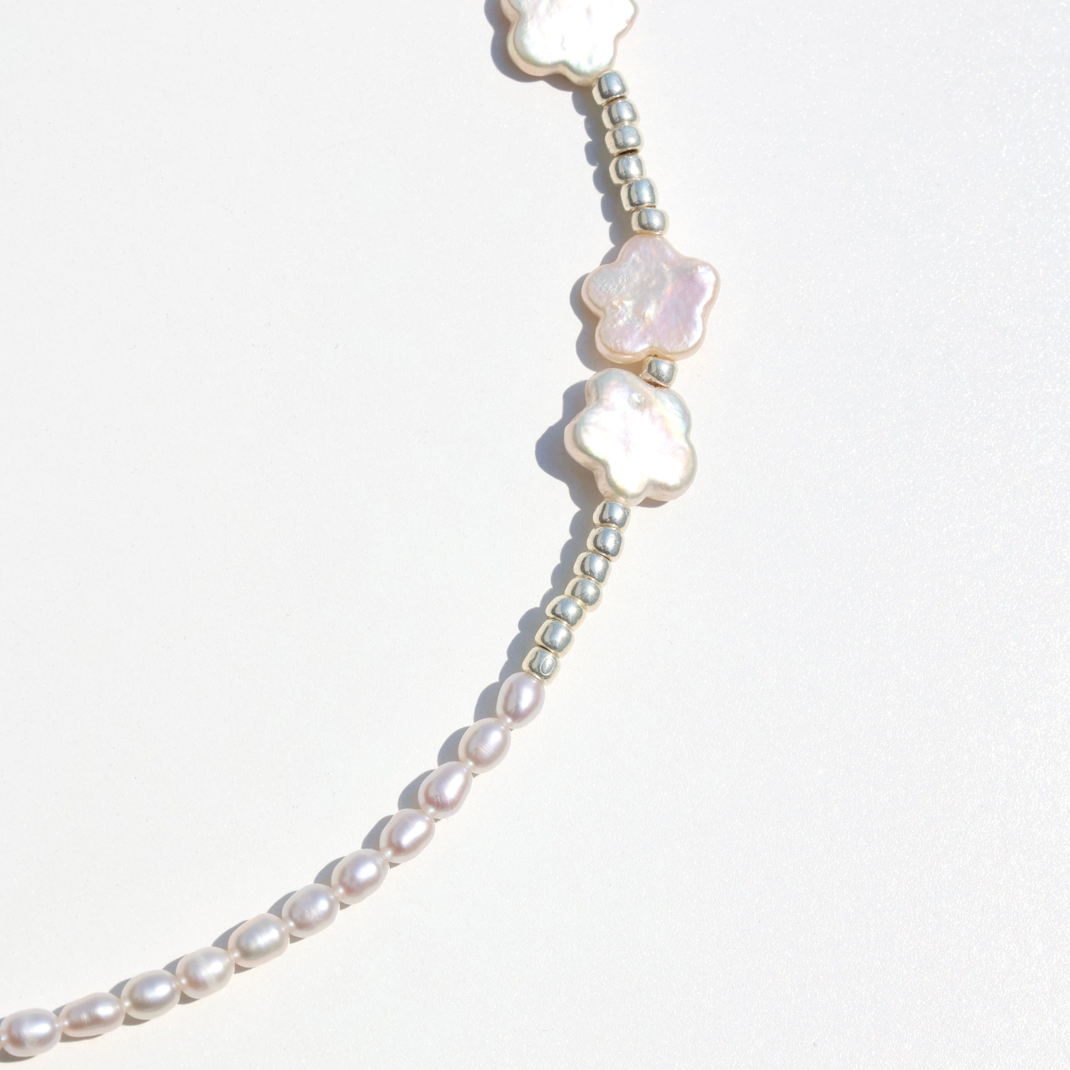 可愛らしいお花の淡水パールとシックな印象に仕上がるシルバービーズのコントラストが特徴的なアイテム。